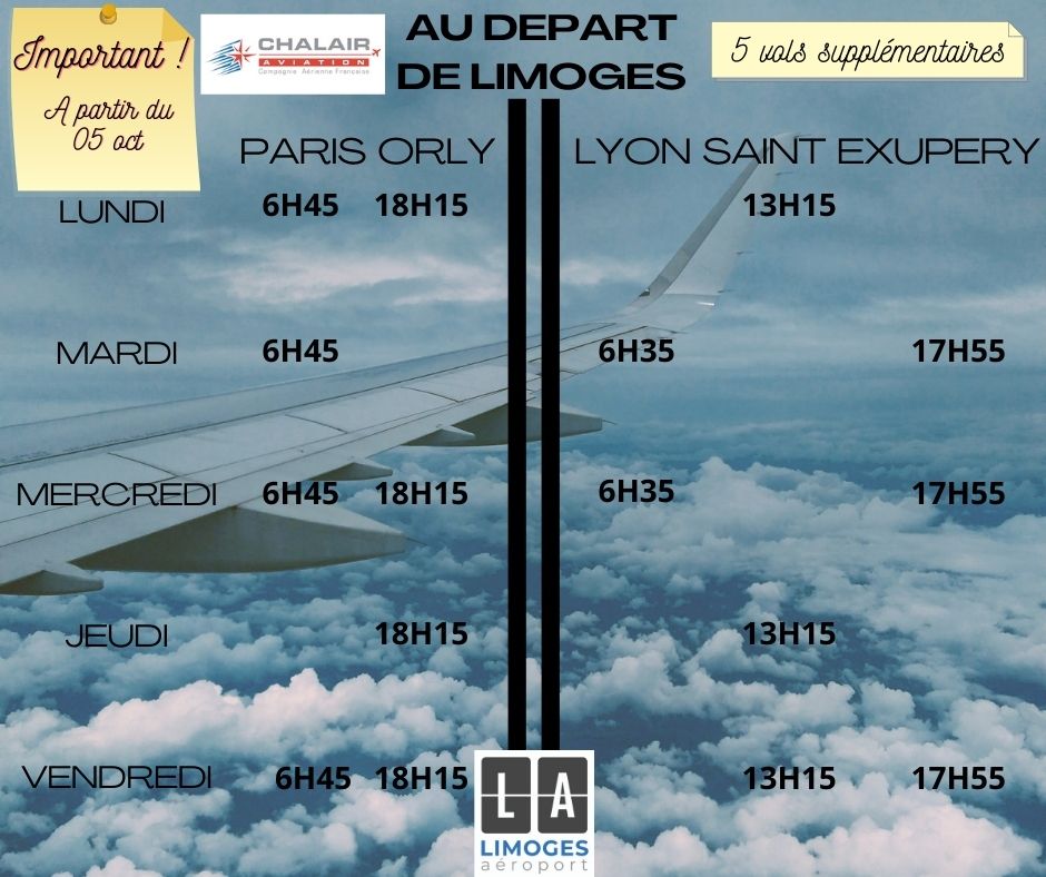 visitez l'article complet ici : https://www.tourmag.com/La-Rochelle-Poitiers-et-Limoges-reprise-des-vols-Chalair-au-depart-de-Lyon-lundi-15-juin_a103921.html Carte routière, carte du relief, cartes administratives, informations géographiques et localisation de limoges sur la carte de france pour vous aider dans le choix de votre destination ainsi que pour l'emplacement de l'hotel voici : Au cours des dernières heures, nous avons trouvé un billet de lyon à limoges à partir de 116 €. Le vol aux instruments ou ifr (instrument flight rules) est un type de vol qui permet de piloter avec la seule aide des instruments de l'avion et du guidage du contrôle l'aéroport international de limoges dispose de tous les équipements nécessaires au vol aux instruments et de toutes les procédures