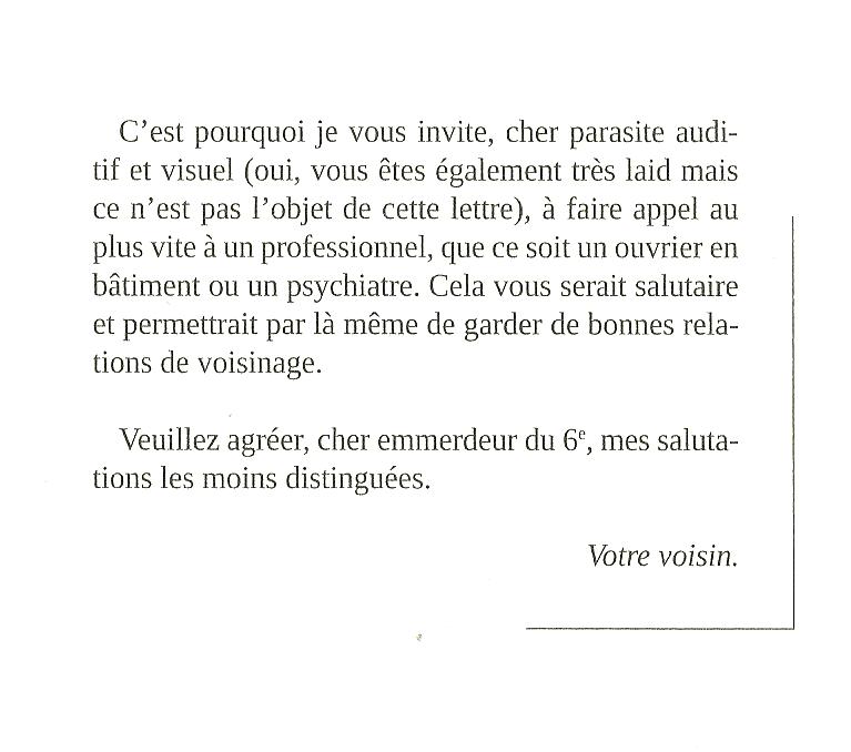 Il convient alors de lui écrire un courrier dans lequel vous ferez part de. Depuis septembre, on subi des nuisances sonores de notre voisin du dessus.