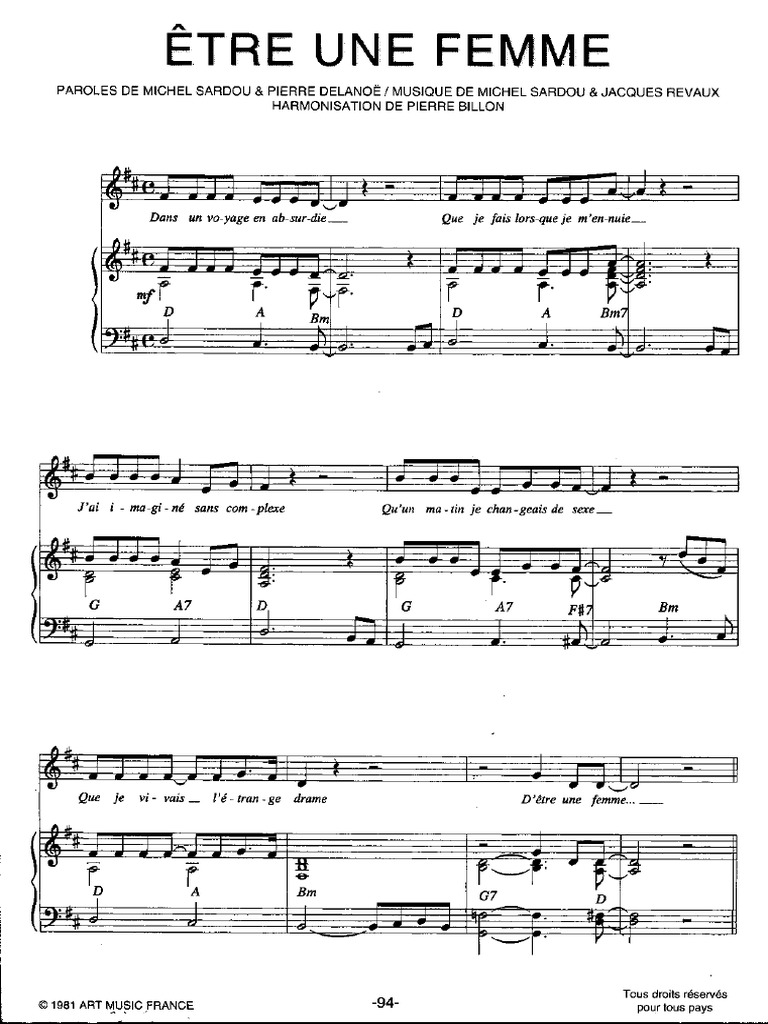 Paroles de être une femme (2010) par michel sardou. Michel sardou & jacques revaux & pierr. Paroles de la chanson etre une femme 2010 par michel sardou dans un voyage en absurdie que je fais lorsque je m'ennuie j'ai imaginé sans complexe qu'un matin je changeais de sexe que je vivais l'étrange drame d'être une femme
